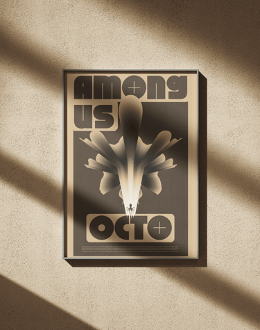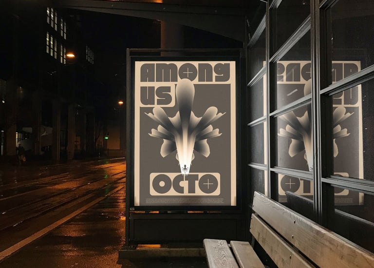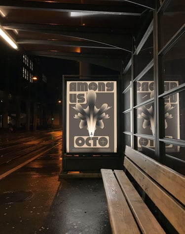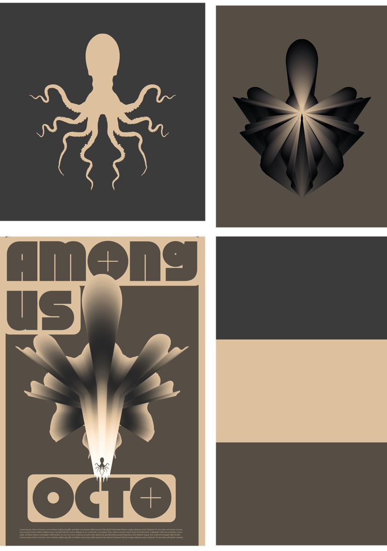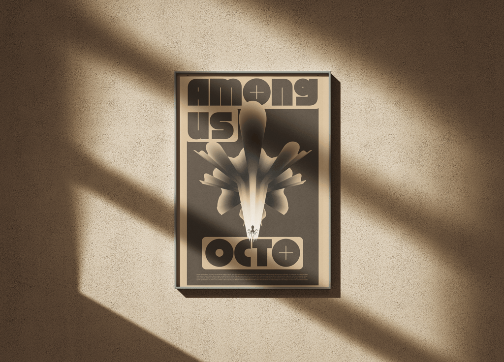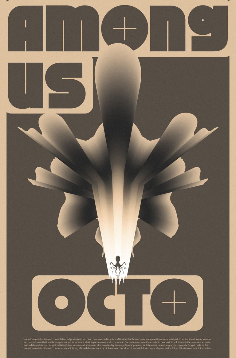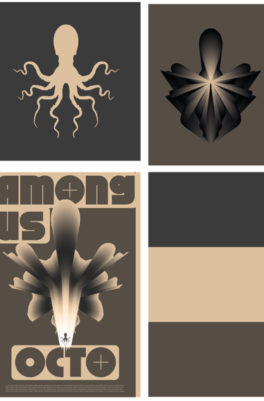 L'affiche met en scène une série de déclinaisons graphiques basées sur la figure d'un poulpe, évoluant de manière abstraite à travers des scènes énigmatiques. Cette figure animale, souvent associée aux visiteurs extraterrestres dans la culture populaire, renforce le mystère en suggérant que ces entités sont déjà parmi nous.