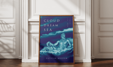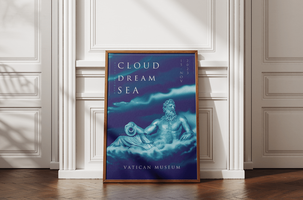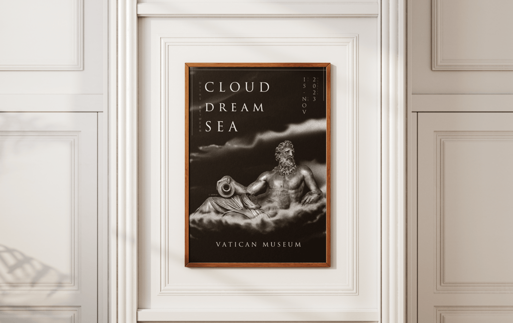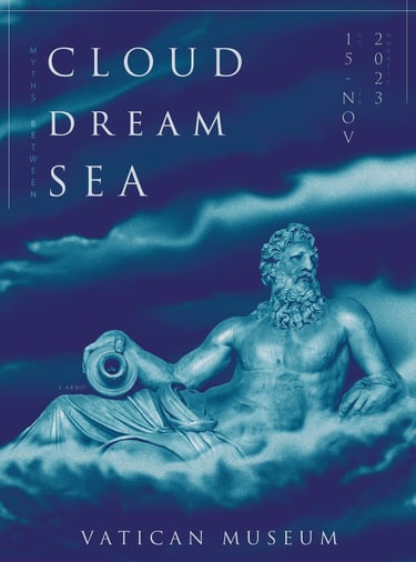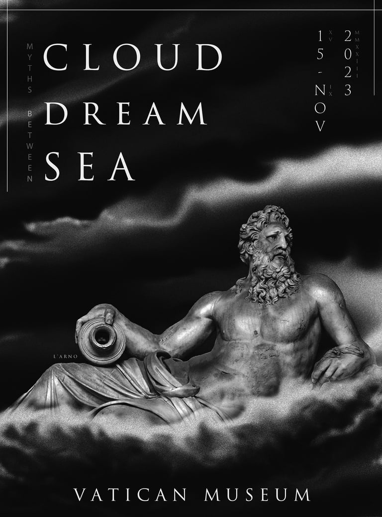Ce concept d'affiche met en avant une exposition fictive du musée du Vatican. Elle s'articule autour de trois mots évoquant à la fois l'imagination et les fantasmes : les rêves, le ciel et l'océan. Les mythes de l'antiquité ont été construits à travers ces concepts. Par conséquent, l'affiche ci-dessus vient mettre une lumière "L'Arno" une célèbre sculpture du musée du Vatican, qui ici semble flotter entre vagues et nuages dans une atmosphère étrange et reposante.