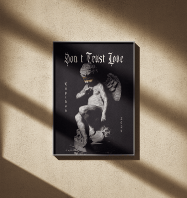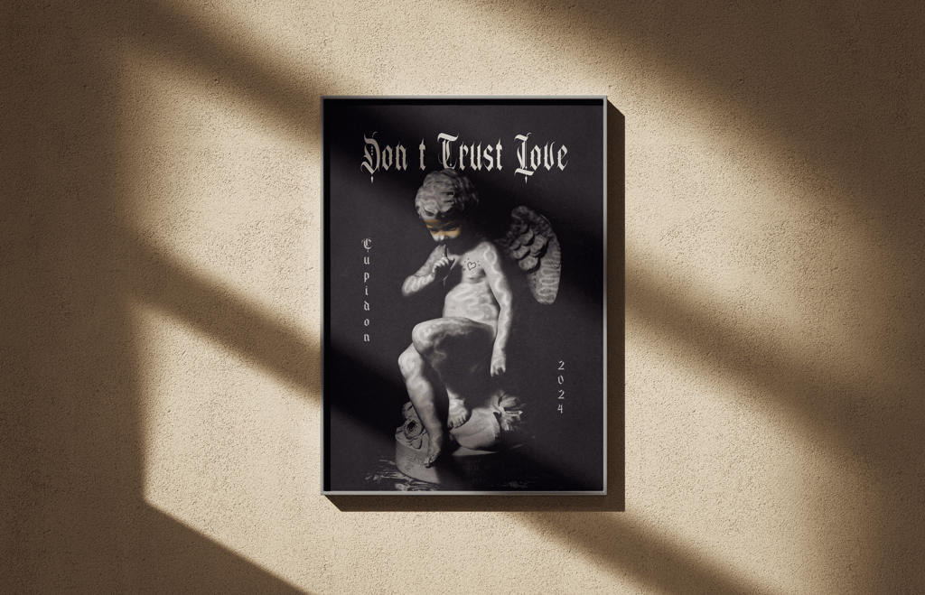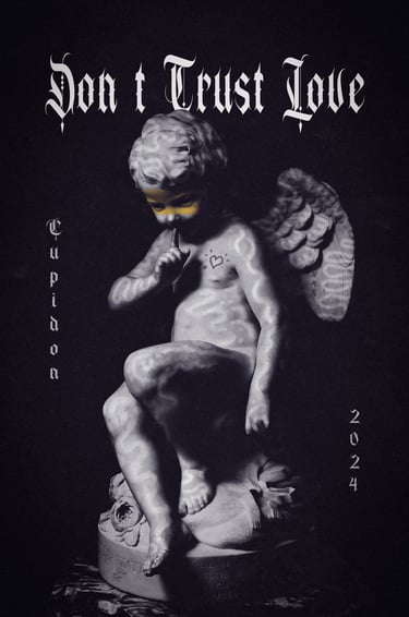 Concept d'affiche qui détourne les valeurs morales habituellement accordées à Cupidon, représenté ici comme sombre et mesquin.
